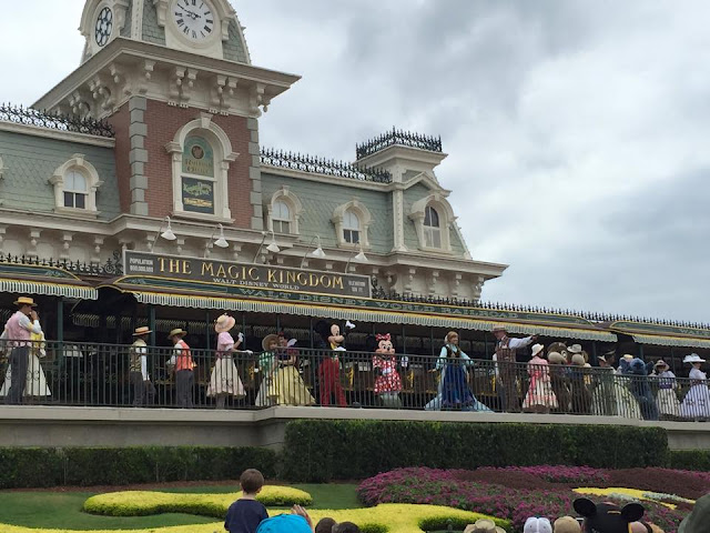 Today was Brian's actual birthday and we had planned to go to Magic Kingdom. Our first park day! We were up at the crack of dawn to catch the buses and make sure to get to the park before it opened so that we could see the arrival show. It was so cute and I have to say a little magical. My hurt felt very happy knowing that my little baby girl was getting to see her precious Minnie and Mickey. Yes, that happened! HAHA! We headed in once the doors opened and after I had finished feeding Bryce his oatmeal while sitting on the ground. We saw that Minnie was setting up right inside the doors for meet and greets. We decided to stand in line and meet her and let me tell you - my heart almost exploded. Myla wasn't scared at all and actually gave her a huge kiss and hug. My trip was made right there!